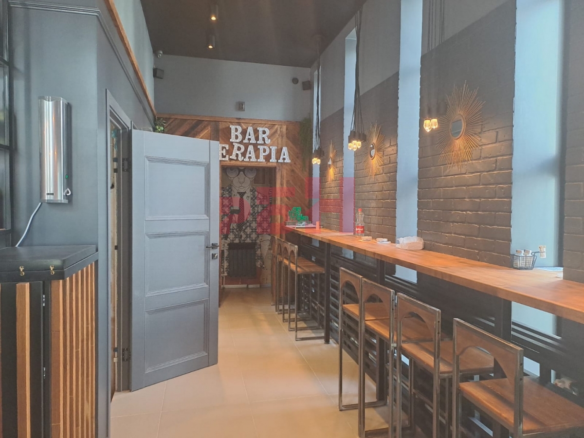 -два этажа, на первом бар с кухней и санузел, в подвальном помещении офис и санузел;